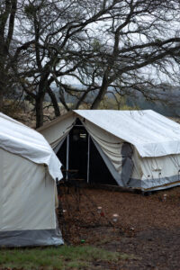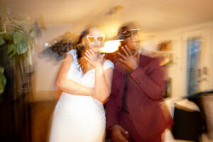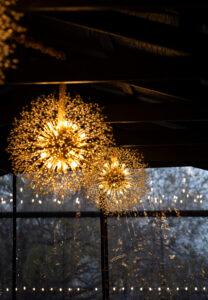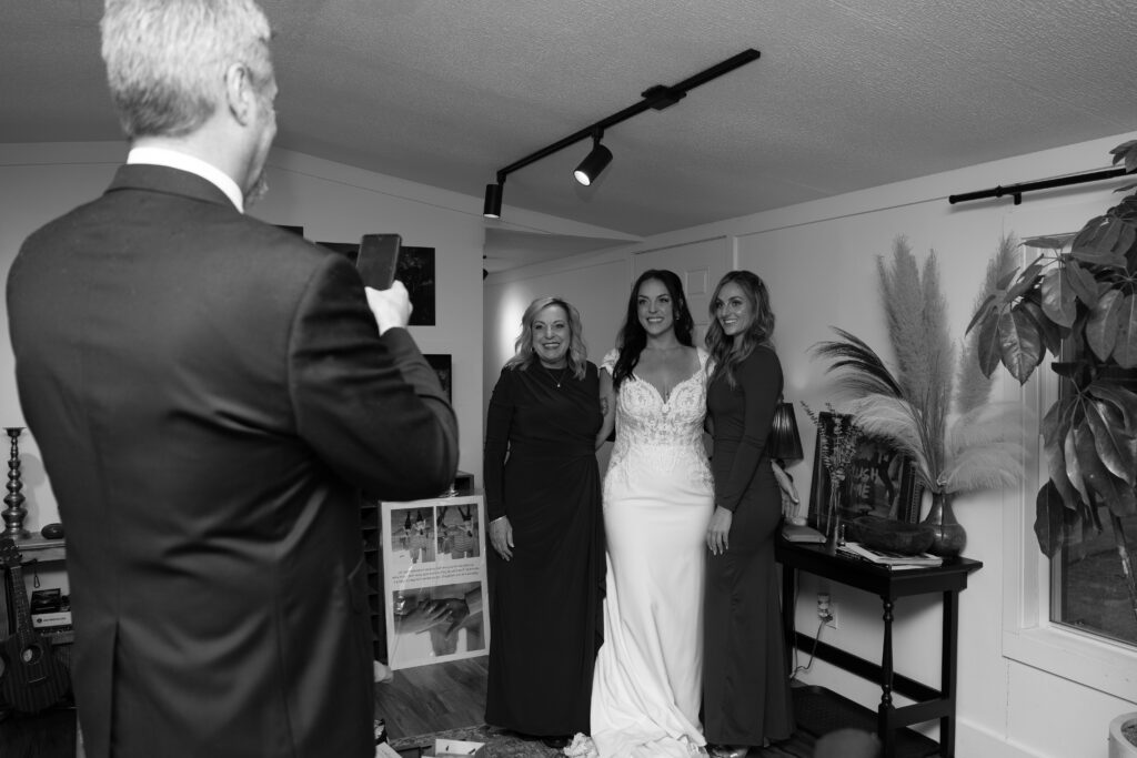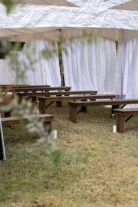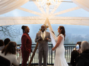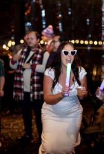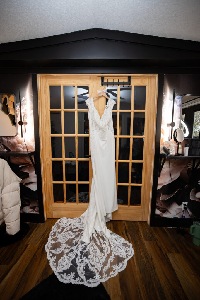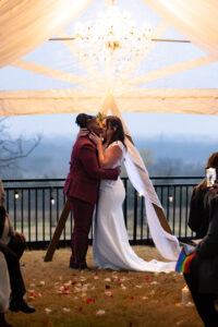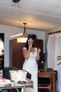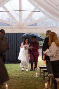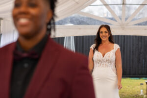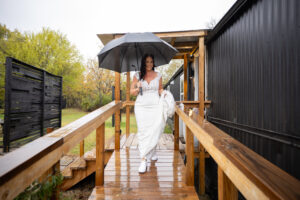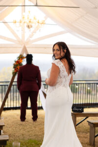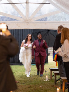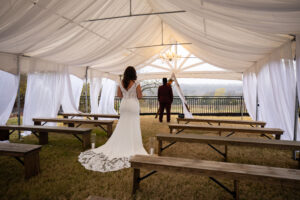 The wedding venue had these cool grounds that included separate getting ready spaces. While Sam got ready in the main house, Yazmeen got ready in the glamping tents a short walk away. Even in the winter rain, this was such a fun space! The ceremony space was also tented, and the reception space was covered and heated for guests to keep dry and warm. Perfect for their romantic, mid-size wedding. I love when wedding venues have solid options for rainy days – that’s such a dealbreaker when planning your wedding day!
