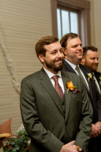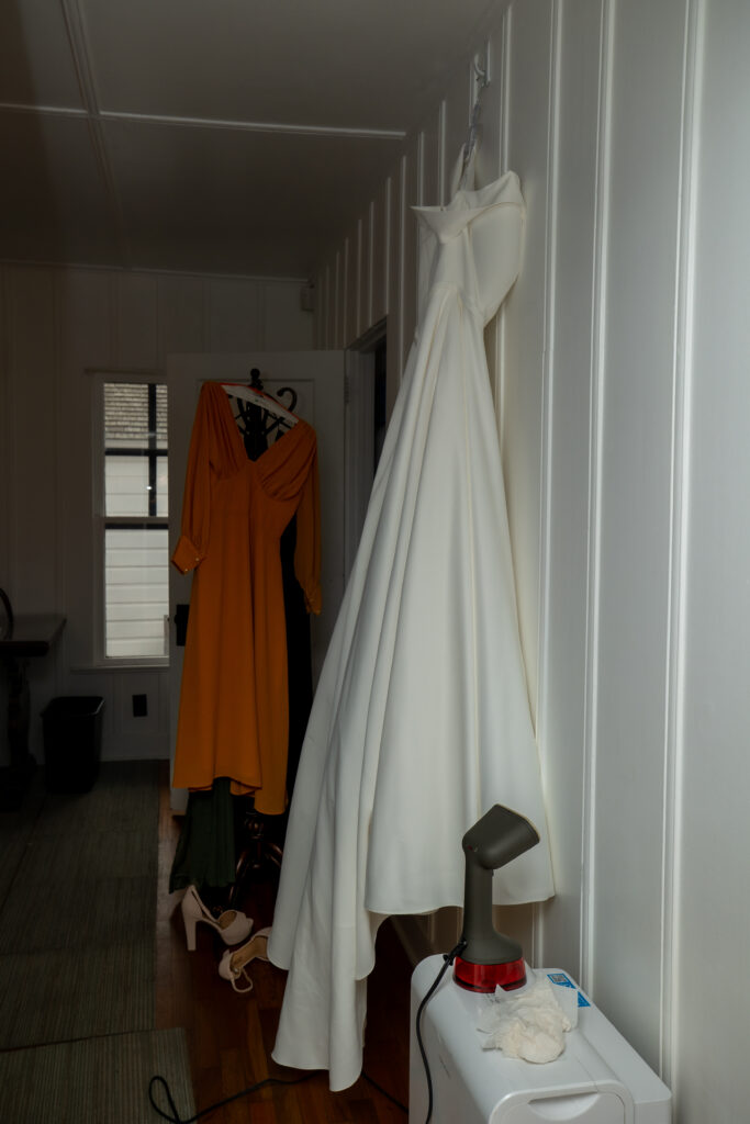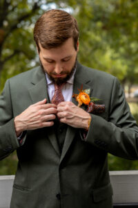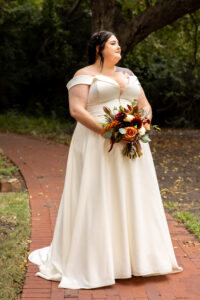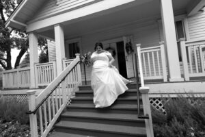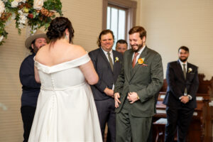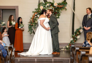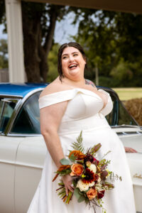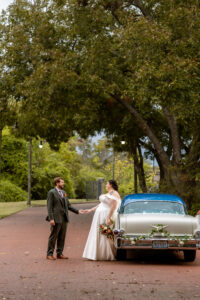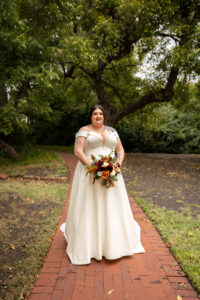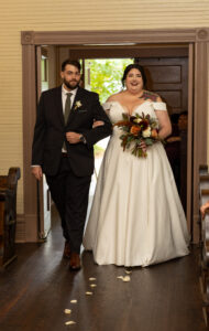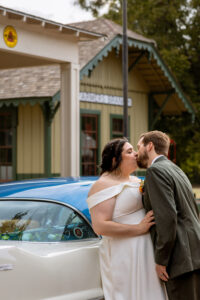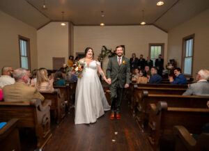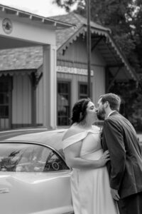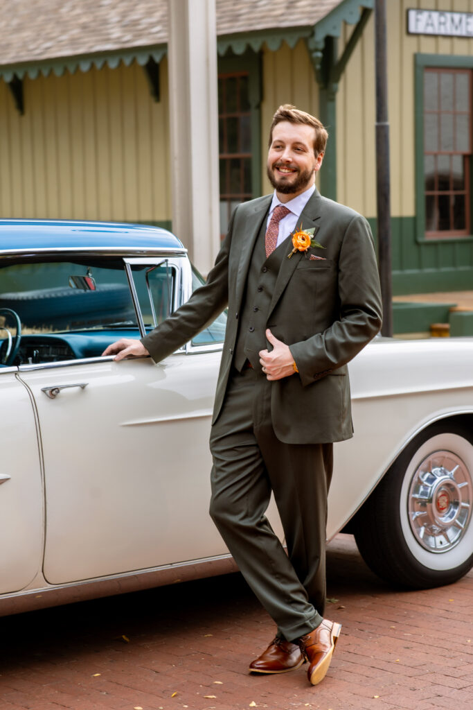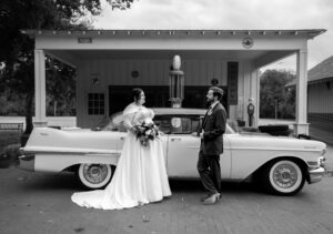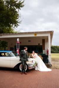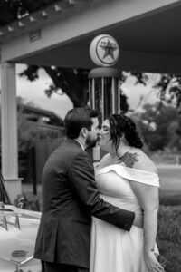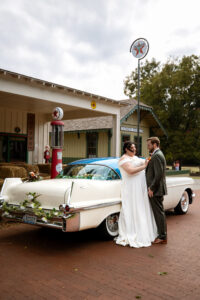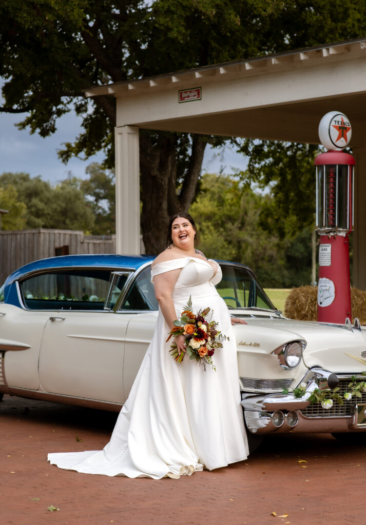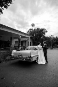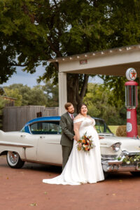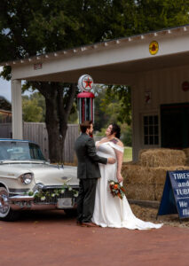 The Farmers Branch Historical Park is such a cute place for a wedding. Their wedding ceremony was in the Old Church, while the close-by cottage house acted as the bridal suite. Farmers Branch Historical Park has a vintage feel all throughout. The restored buildings, gas pumps, and brick streets were the perfect backdrop for newlywed portraits with their friend’s classic car after saying their vows.